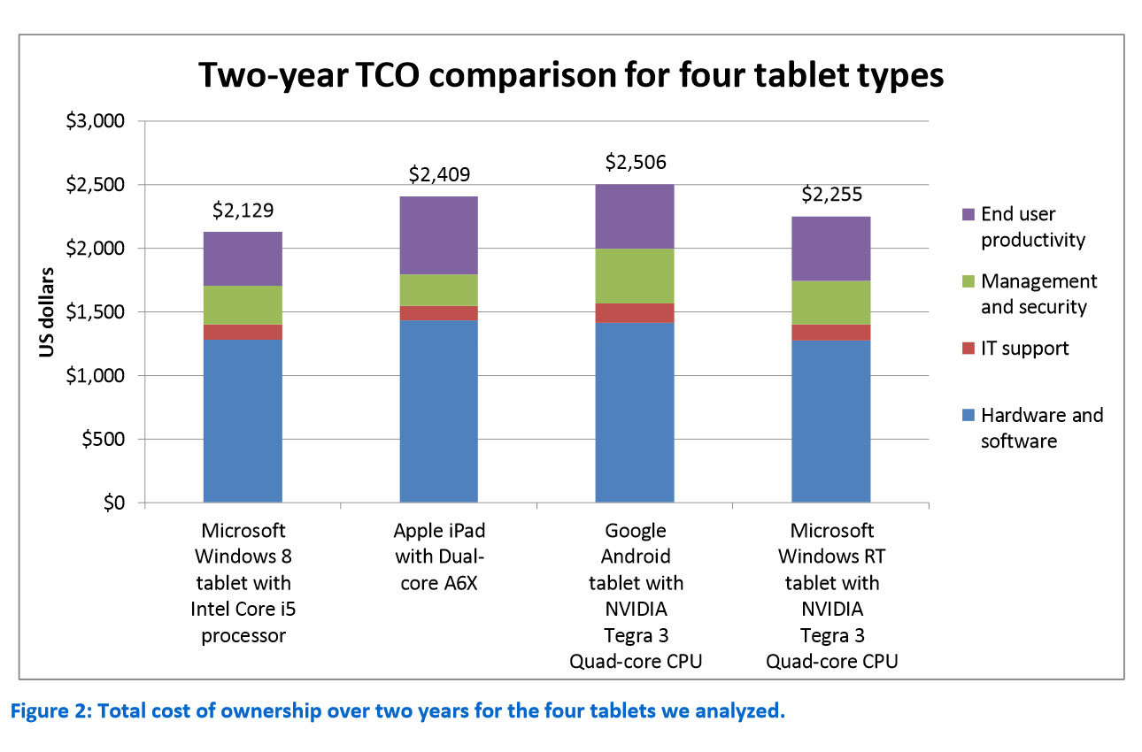 Dans une autre étude, le numéro un mondial du microprocesseur explique que les tablettes sous Windows sont plus faciles à implémenter en entreprises que celles sous d’autres systèmes. Leur exploitation revient notamment moins cher que lors de l’utilisation de modèles sous Android et iOS. Il indique d’ailleurs qu’Android serait particulièrement onéreux.
